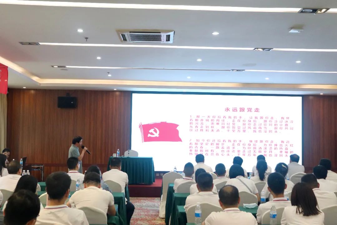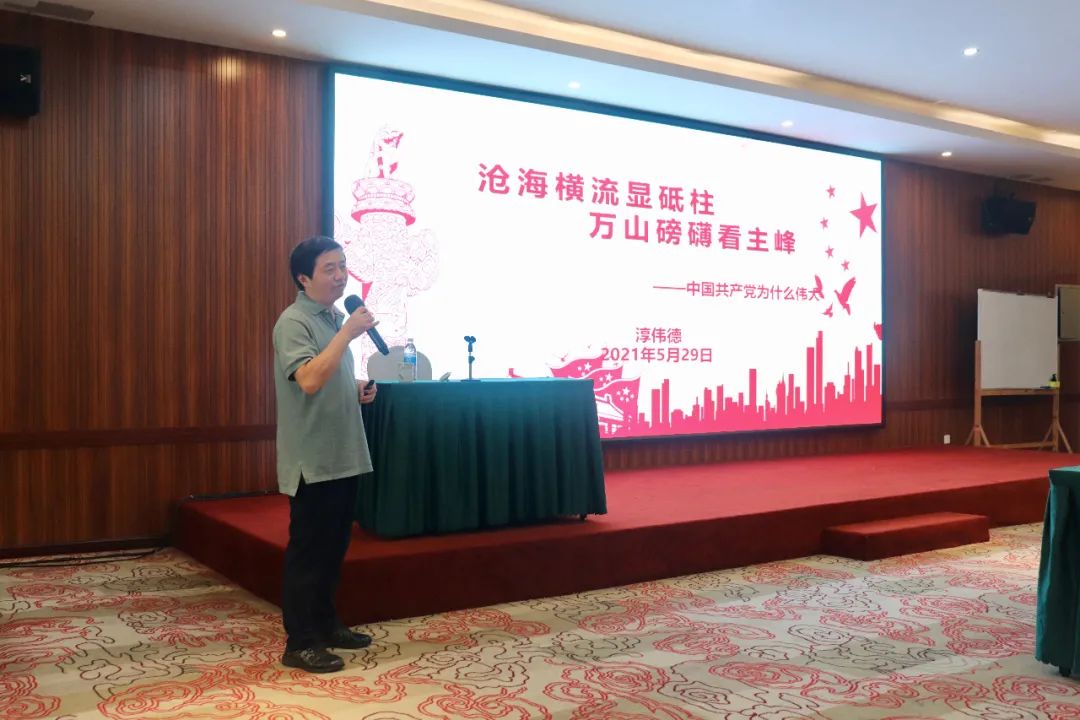 會議開始,由成都理工大學(xué)管理科學(xué)學(xué)院院長淳偉德教授對公司全體員工進(jìn)行《滄海橫流顯砥柱,萬山磅礴看主峰—中國共產(chǎn)黨為什么偉大》為主題的黨史教育。淳院長:二級教授,作為管理學(xué)博士,專業(yè)為公司理財與公司治理、金融工程與風(fēng)險管理,卻從中國近代史的角度,結(jié)合自身的學(xué)習(xí)為大家講了一堂激蕩靈魂的黨史課。作為一名有著37年黨齡的老黨員,淳院長講述了中國共產(chǎn)黨經(jīng)過艱苦卓絕的斗爭到成長壯大的創(chuàng)立背景,無數(shù)先輩的英勇斗爭到當(dāng)代愛黨愛國人士的奉獻(xiàn)事跡。用黨的奮斗史教育引導(dǎo)碩特環(huán)保全體員工:堅持和完善黨的領(lǐng)導(dǎo),是黨和國家的根本所在、命脈所在,是全國各族人民的利益所在、幸福所在。黨的領(lǐng)導(dǎo)地位是歷史的選擇、人民的選擇!
